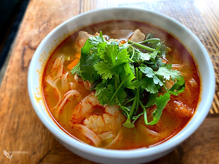 ツルツルもちもちの米粉麺をひと口すすれば、ピリッとした辛さと、レモングラスとライムの爽やかな香りがふわっと広がります。