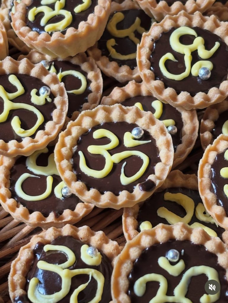 タルト生地に溶かしたチョコを流し込んで、ひとつ一つに🕉️をチョコで描きました☺️