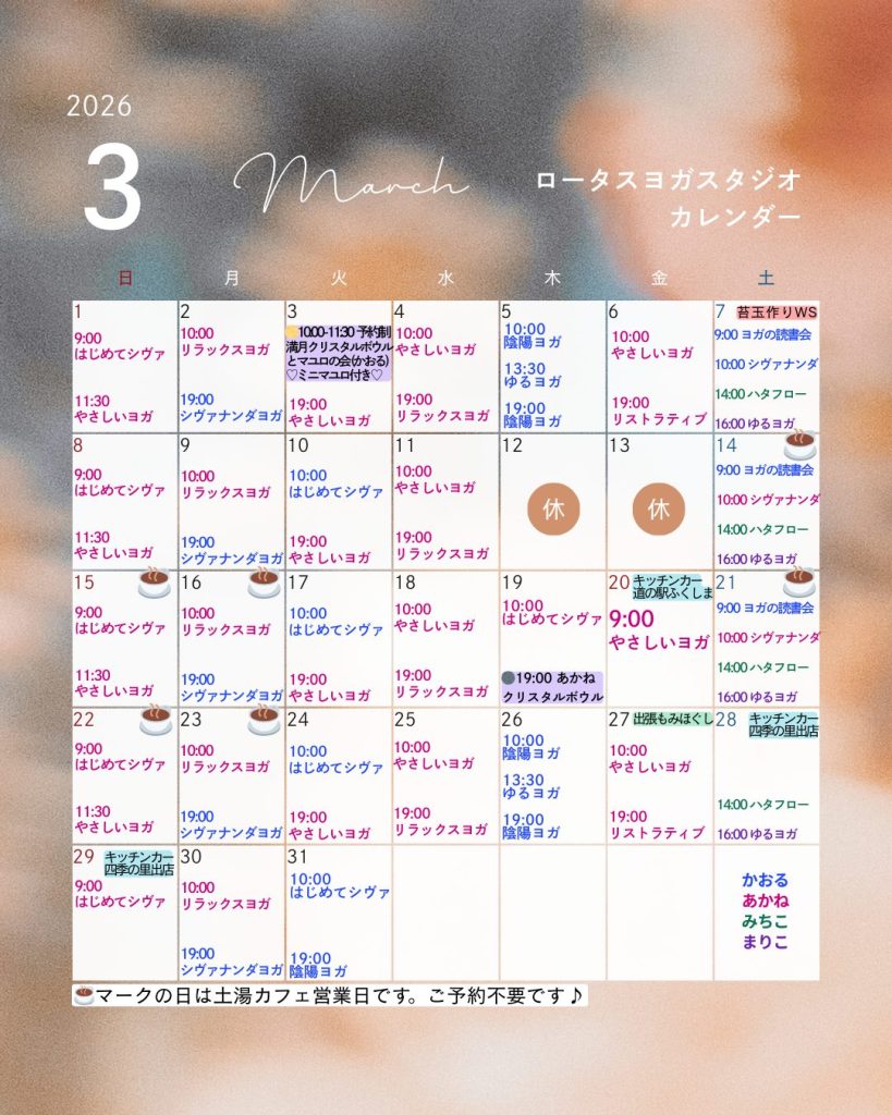 3月より月曜日10時のやさしいヨガ➡リラックスヨガ、金曜日10時のリラックスヨガ➡やさしいヨガに変更致します。